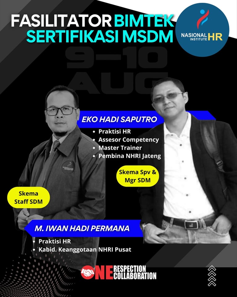 Nasional HR Institute (NHRI) kembali menghadirkan kegiatan Bimbingan Teknis (BIMTEK) Sertifikasi MSDM pada tanggal 9–10 Agustus. Acara ini menjadi momentum penting bagi para praktisi HR untuk meningkatkan kompetensi, sekaligus menyiapkan diri menghadapi uji sertifikasi resmi di bidang Manajemen Sumber Daya Manusia (MSDM).